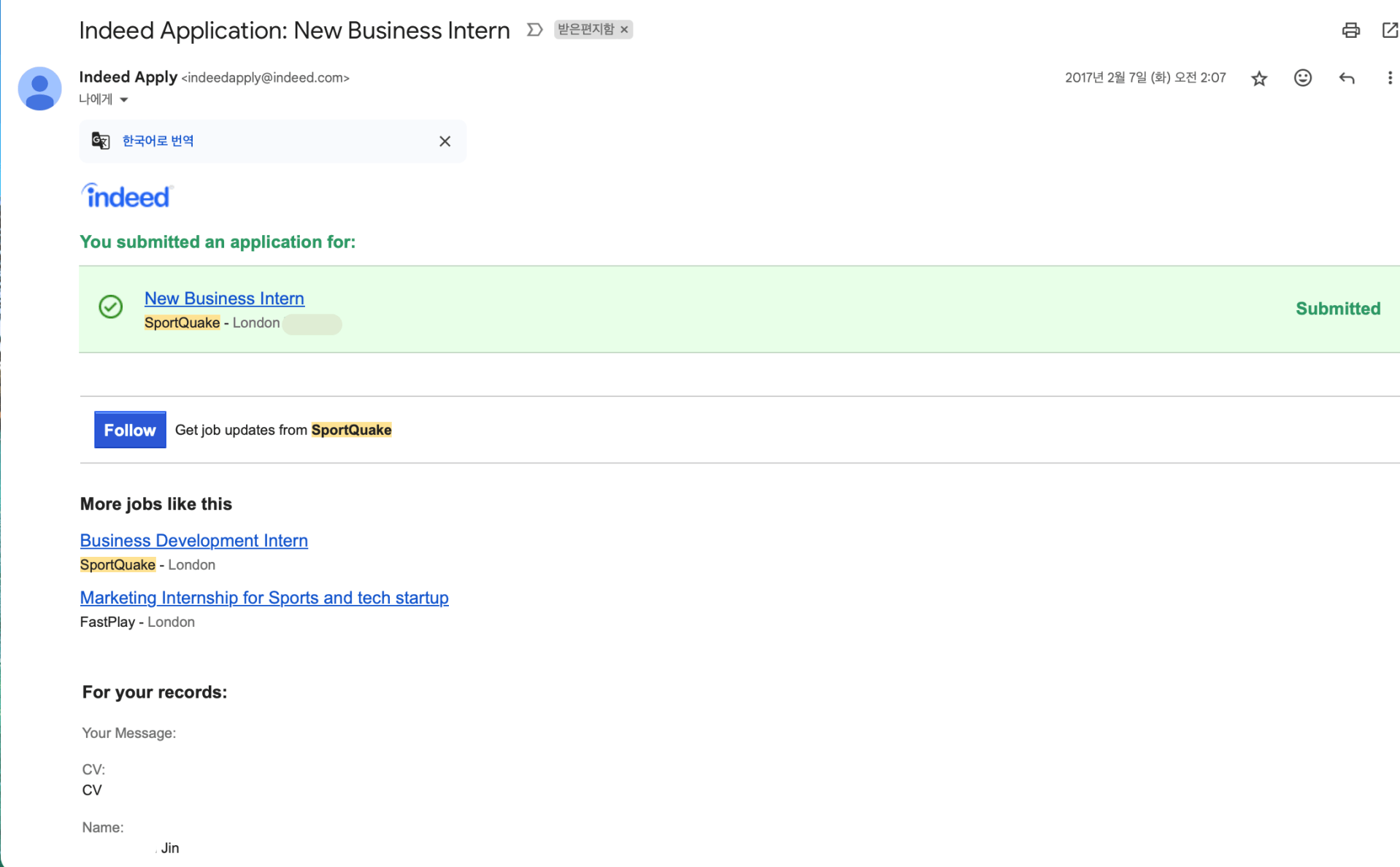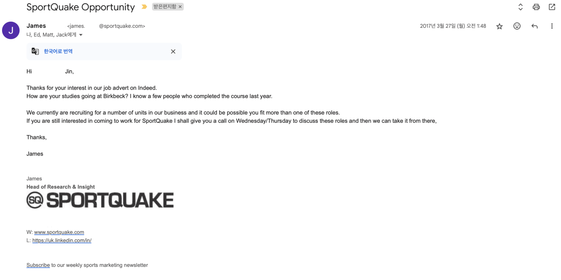여러 페이지를 검색한 결과, 런던 중심부에 위치한 SportQuake 라는 스포츠 마케팅 에이전시에서 New Business Intern 을 채용하고 있었고, ‘잘 해낼 수 있을까’ 라는 걱정과 함께 지원서류를 제출하였다.
